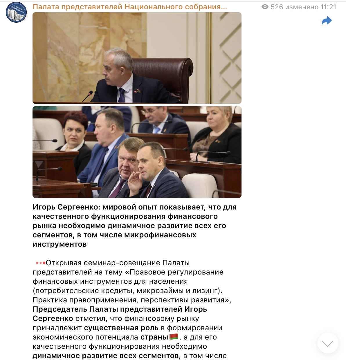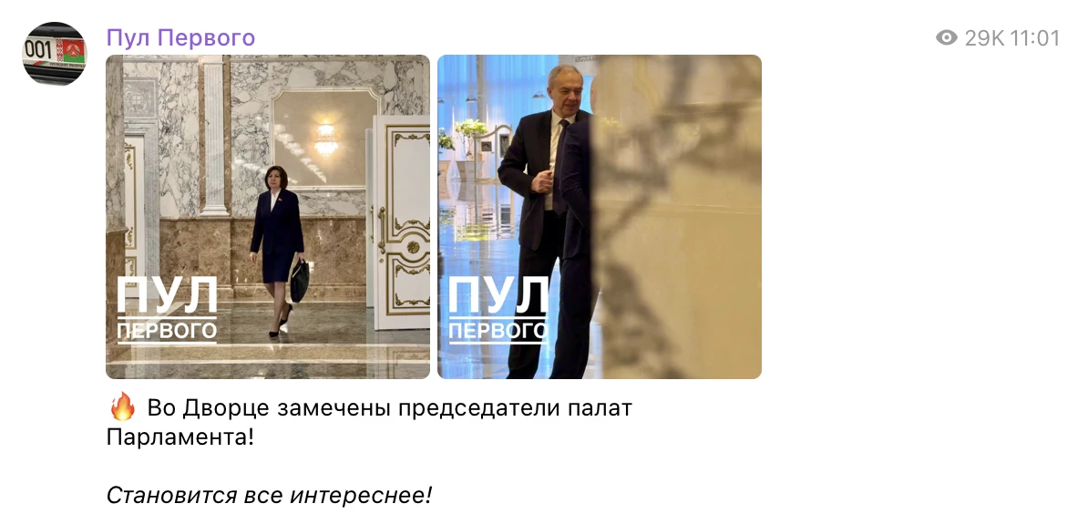 Так, в 10:23 Сергеенко «прямо сейчас» открывал семинар-совещание Палаты представителей, выступив там в 11:21 с приветственном словом, а в промежутке, в 11:01, был «замечен» «Пулом Первого» во Дворце независимости, где Лукашенко производил кадровые перестановки.