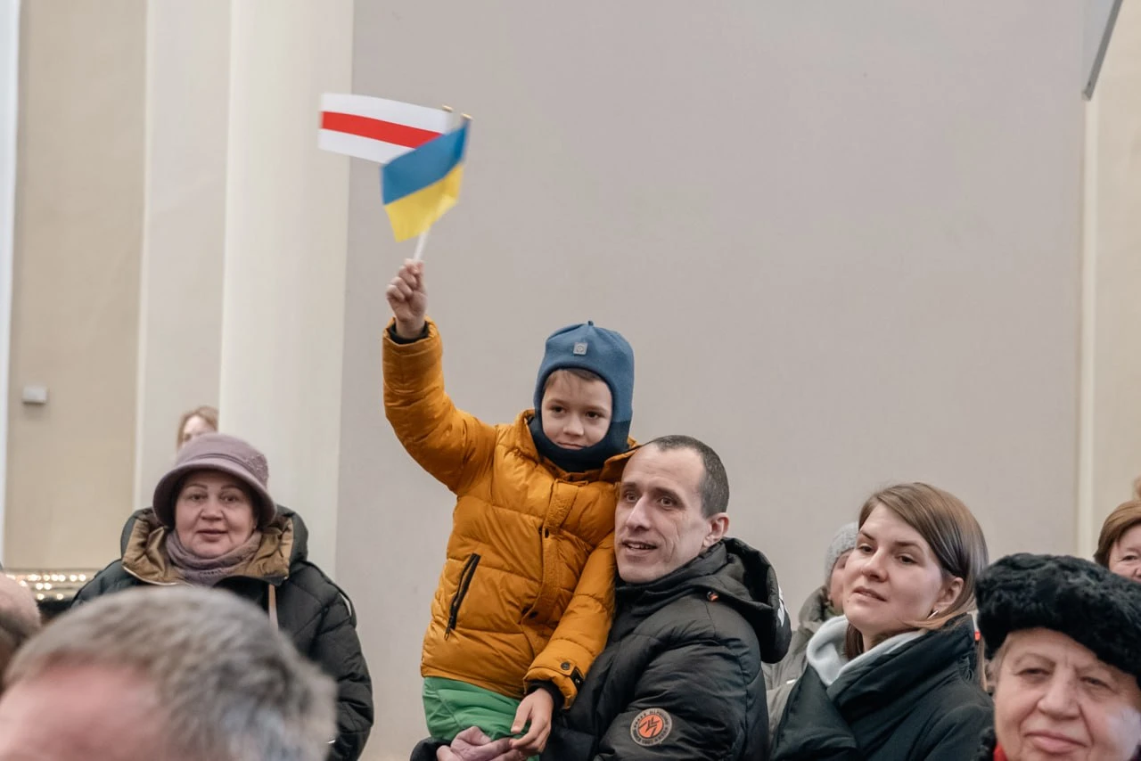 Недавно освобожденный политик Павел Северинец пришел на мероприятие со своим сыном. Фотограф запечатлил Францишка с двумя флажками, которые он держал в руке — беларуским и украинским.