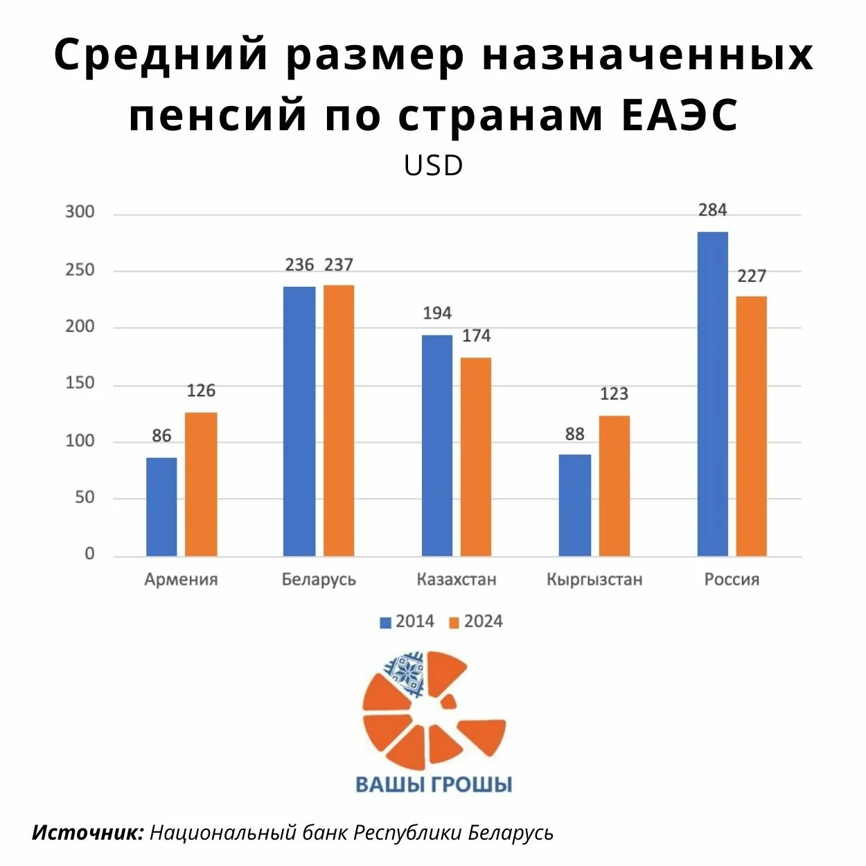 На этом месте обычно и делают многозначительную паузу: «Беларусь — первая в ЕАЭС». Формально да. Но это — лидерство внутри бедной лиги, и это хорошо видно, если расширить рамку до 10 лет. В 2014 году пенсия в Беларуси была на уровне $236 в месяц (среднее за год), а в 2024-м — $237. Плюс один доллар за десятилетие — почти нулевая динамика.