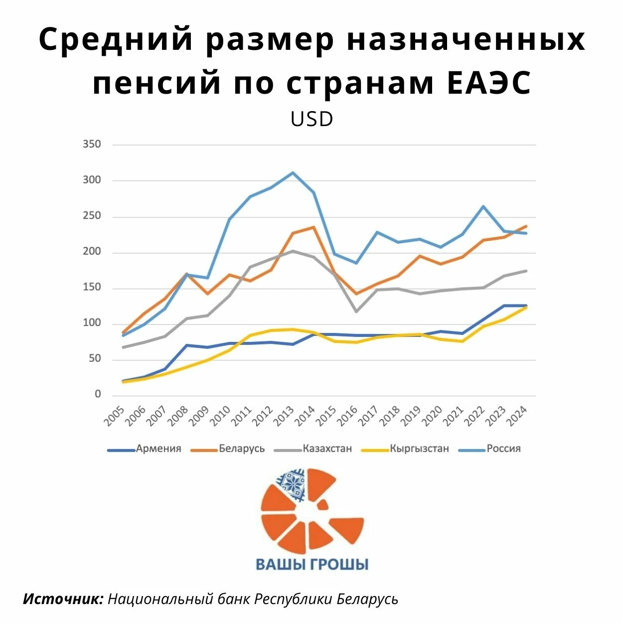 Самые удобные для такого сравнения данные дает статистическая серия Евразийской экономической комиссии по «среднему размеру назначенных пенсий» в странах ЕАЭС (показатель сразу публикуется в долларах США).