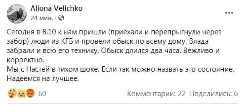 Позже стало известно, что утром прошел обыск дома у Влада Величко, соратника Владимира Мацкевича.