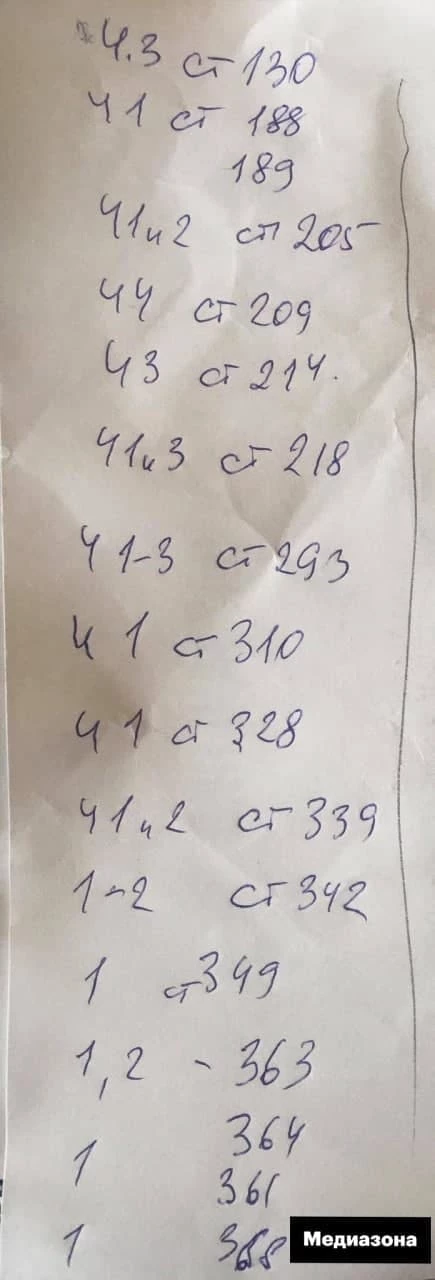 Как рассказала Алена Величко Медиазоне, ей не разрешили сфотографировать постановление об обыске. Поэтому она выписала статьи, которые были указаны. По ее словам, он подозреваемый по всем указанным 17 статьям.
