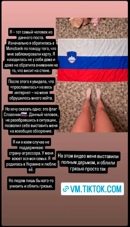 Однако девушка заявила, что ее несправедливо обвинили в пророссийских взглядах: она находится в Европе и в кадр попал флаг Словении.