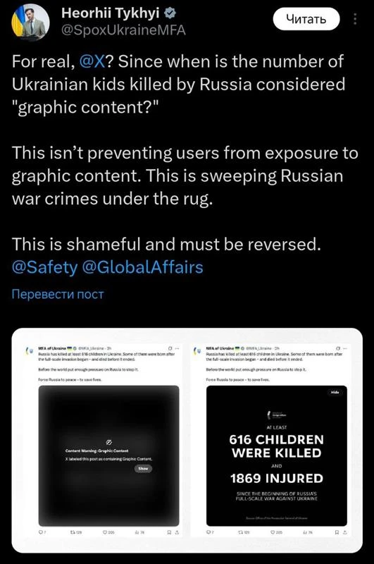 Соцсеть Х скрыла от пользователей картинку, которую запостил МИД Украины об убитых украинских детях.
