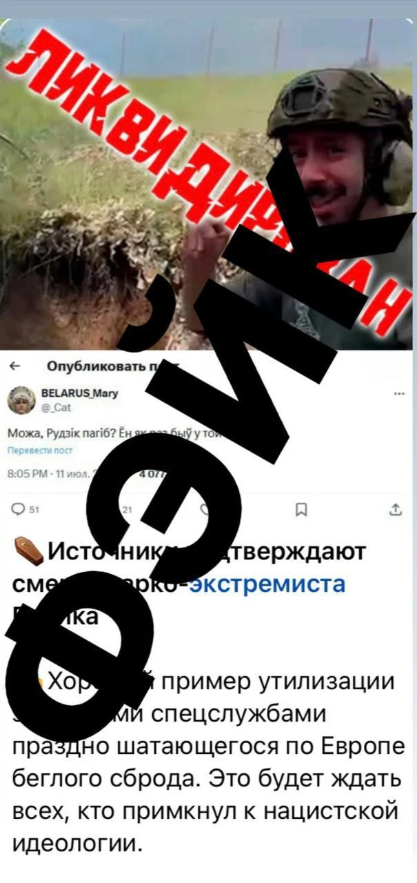 Полк Калиновского опровергнул сообщение телеграм-канала, связанного с Минобороны Беларуси, о гибели Яна Рудика: «Он жив и продолжает выполнять боевые задачи».