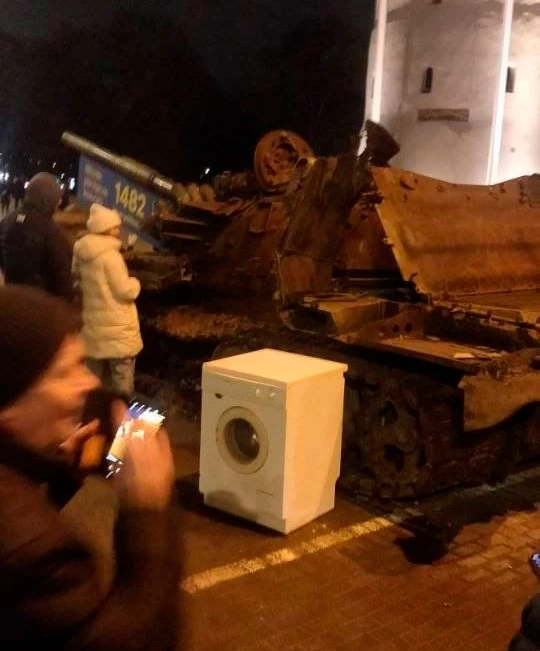 Фотофакт. На Кафедральной площади Вильнюса к разбитому российскому танку, который установили там к годовщине войны в Украине, принесли стиральную машину.