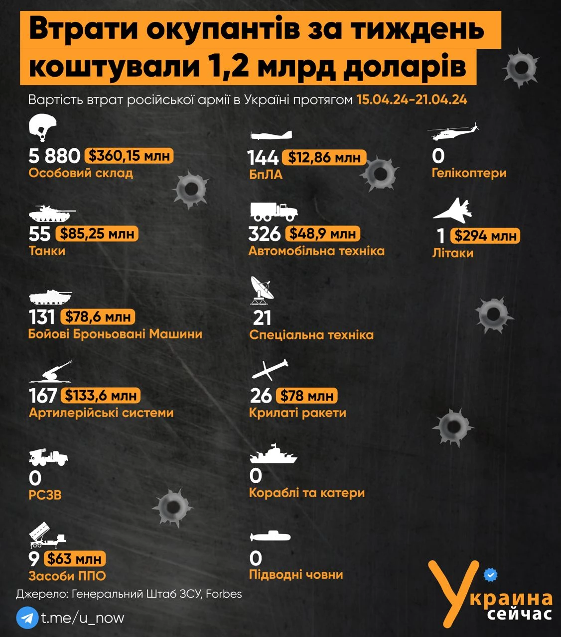 Потери оккупантов за последнюю неделю войны против Украины составили примерно $1,2 млрд.